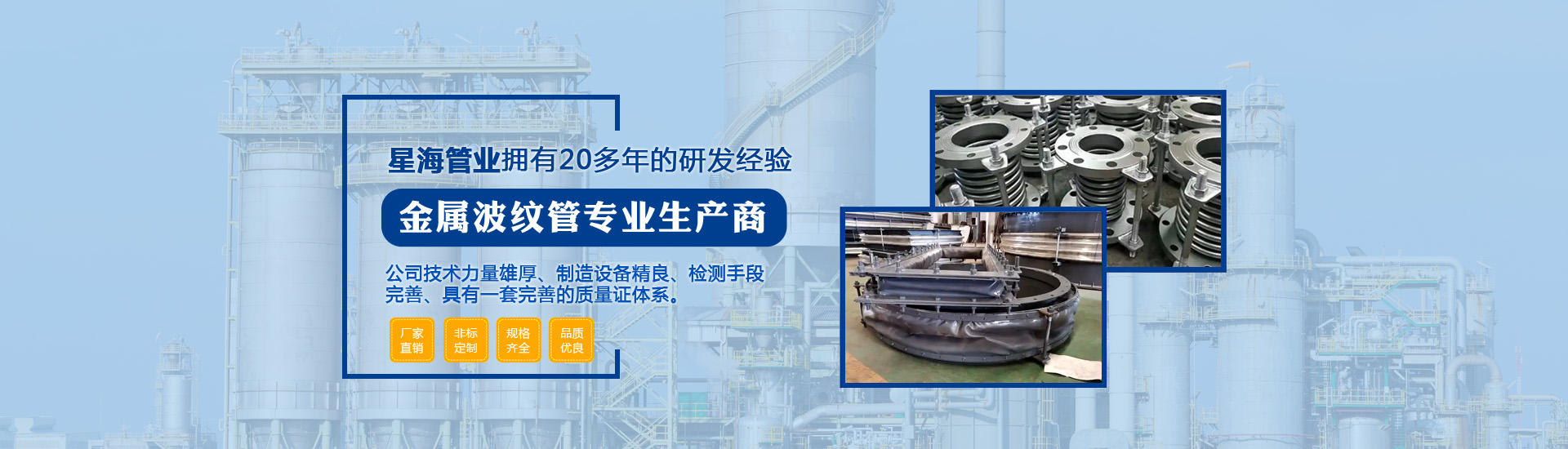 泰州市星海管業(yè)有限公司座落于風(fēng)景如畫的江蘇魚米之鄉(xiāng),是一家專業(yè)生產(chǎn)金屬波紋管的高新企業(yè)。本公司技術(shù)力量雄厚、制造設(shè)備精良、檢測手段完善、具有一套完善的質(zhì)量證體系,系列產(chǎn)品齊全、質(zhì)量可靠、價格合理,深受廣大用戶的信賴和好評。主導(dǎo)產(chǎn)品是金屬波紋膨脹節(jié),不銹鋼金屬軟管,滑動式伸縮節(jié),填料函式伸縮節(jié),橡膠補償接頭,各種型號彈性吊架...